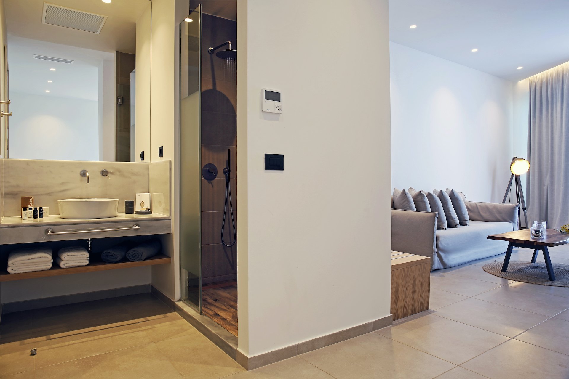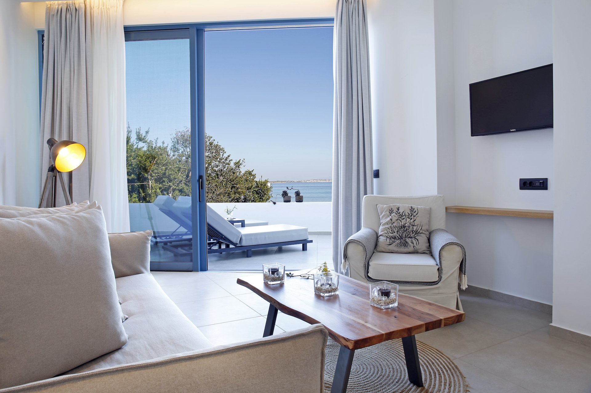 Η νέα, πολυτελής Master Suite με θέα στη θάλασσα θα σας αιχμαλωτίσει με την κομψότητα της. Ο συνδυασμός διακόσμησης του λευκού και αποχρώσεων της άμμου βρίσκεται σε απόλυτη αρμονία με το γαλάζιο του Αιγαίου. Συνδυάζοντας το αξεπέραστο στυλ με την υπέροχη θέα, αυτή η σουίτα αντιπροσωπεύει την κομψότητα και την πολυτέλεια προσφέροντας μεγάλη άνεση και μοναδικό στυλ. Υπάρχει επίσης ιδιωτική βεράντα με ξαπλώστρες. Σχεδιασμένη για να προσφέρει ευελιξία, η σουίτα μπορεί να φιλοξενήσει τέσσερα άτομα, με ένα διπλό κρεβάτι και καναπέδες στο σαλόνι που μετατρέπονται σε δύο μονά κρεβάτια.